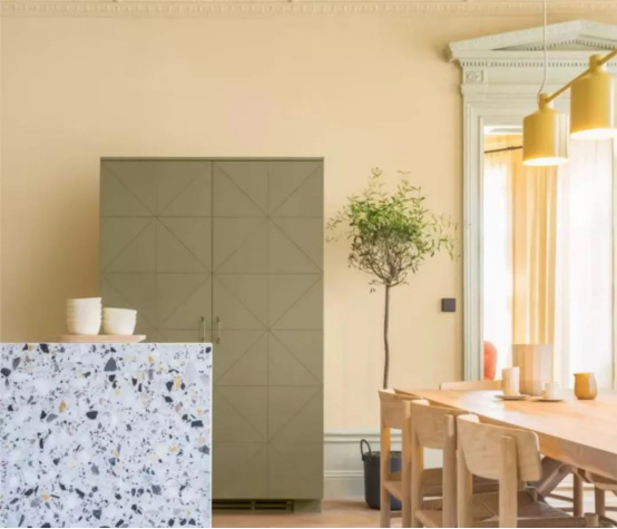 君匠世家艺术涂料抗菌净醛原浆与淡黄色融合,